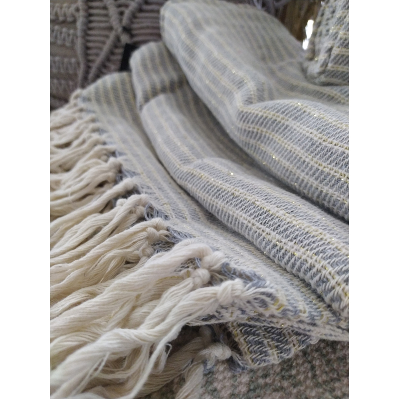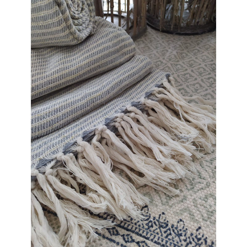 Béžovo - modrý bavlněný pléd se zlatou nitkou a třásněmi - 125*150 cm