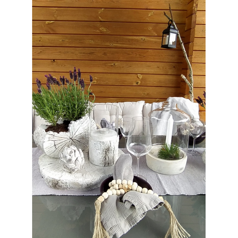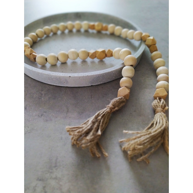 Dřevěná girlanda z dřevěných kulatých a hranatých korálků, vhodná k uvázání závěsů, k omotání jídelního ubrousku či k dekoraci na podnose.