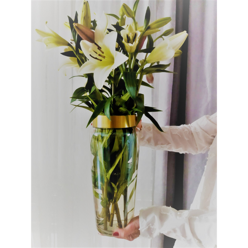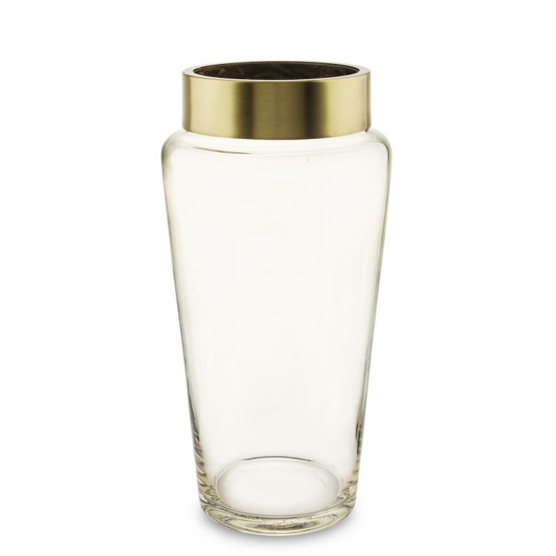 Skleněná váza, zlatý kovový lem, 25x12,35x12,5 cm