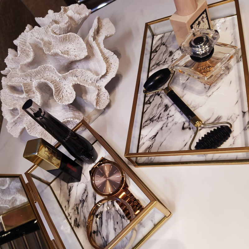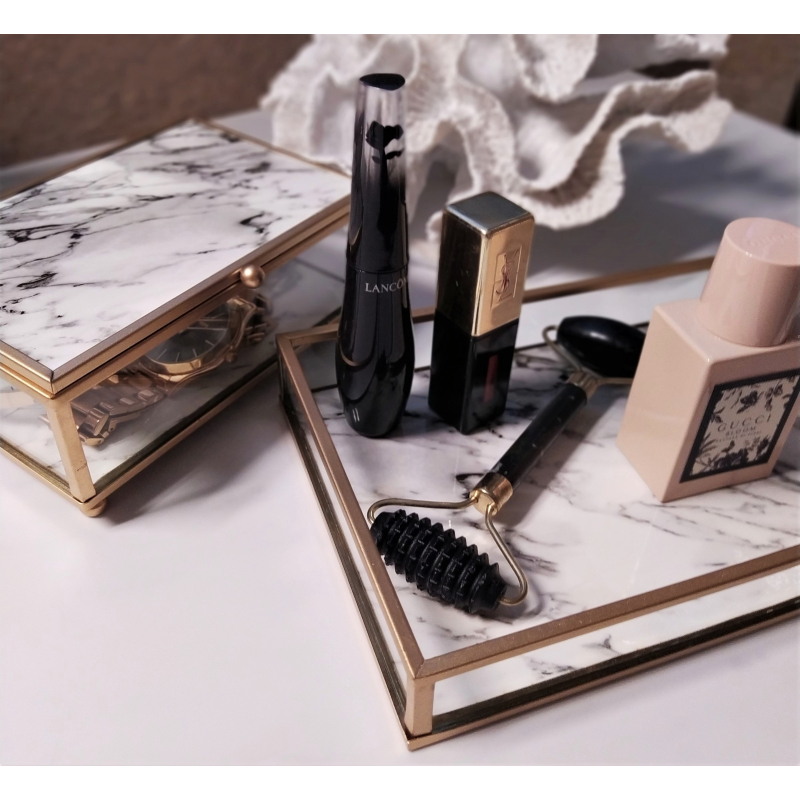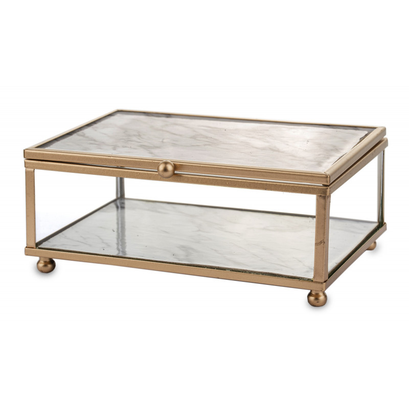 Šperkovnice / box skleněný, uvnitř se zrcadlem a dekorem mramoru - ideální pro Vaše šperky, dekorativní kosmetiku a jiné nezbytnosti.