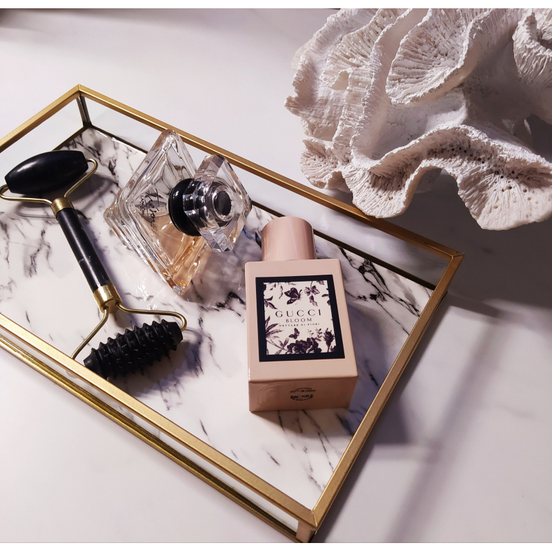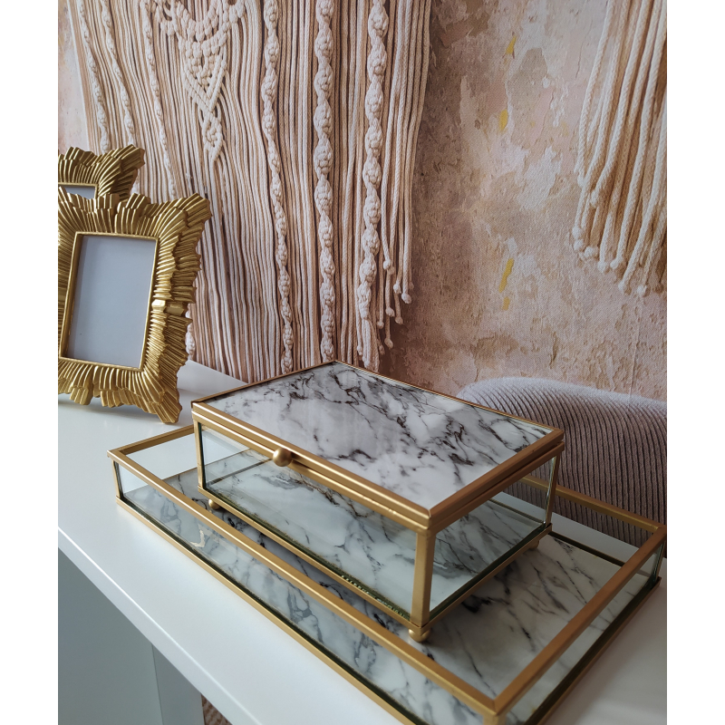 Box skleněný, zlatý kov a dekor mramoru - ideální kombinace na toaletní stolek, do koupelny či na konzolový stolek k odkládání drobností.