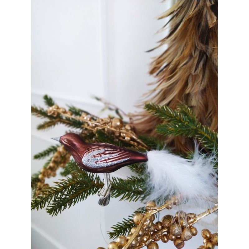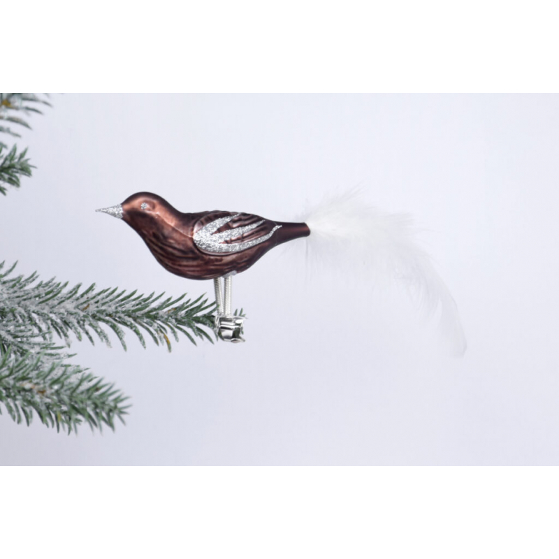 Skleněná ozdoba - hnědý ptáček s ocasem z bílých peříček a stříbrným skřipcem k připevnění.